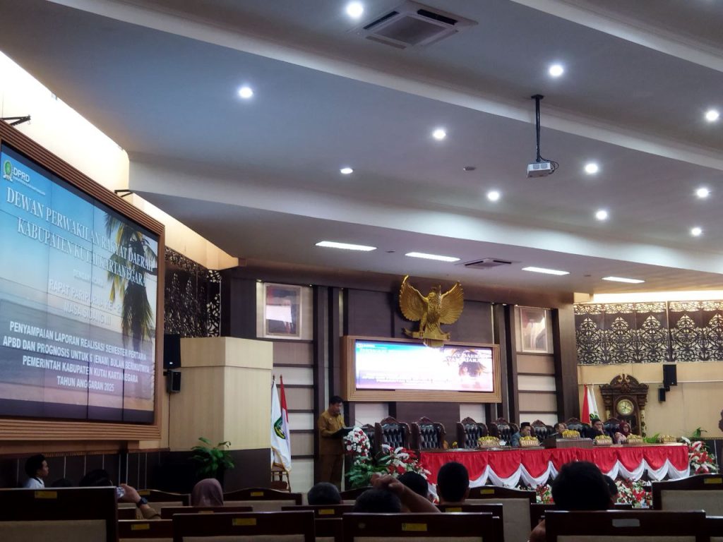 KUKAR – Sekretaris Daerah (Sekda) Kutai Kartanegara (Kukar), Sunggono, memaparkan perkembangan pelaksanaan Anggaran Pendapatan dan Belanja Daerah (APBD) tahun anggaran 2025 pada Rapat Paripurna ke-21 DPRD Kukar, Senin (21/7/2025). Rapat yang berlangsung di ruang utama DPRD itu dipimpin langsung oleh Ketua DPRD Ahmad Yani.